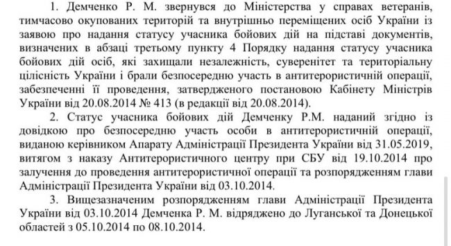 Демченко получил статус УБД всего за 3 дня пребывания на Донбассе. Документ