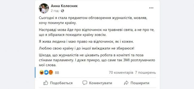 Впоследствии Анна Колесник удалила сообщение, а через некоторое время скрыла почти все предыдущие сообщения на своей странице в Facebook.