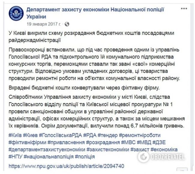 В январе 2017 г. Департамент защиты экономики Национальной полиции Украины сообщил о раскрытой схеме хищения бюджетных средств.