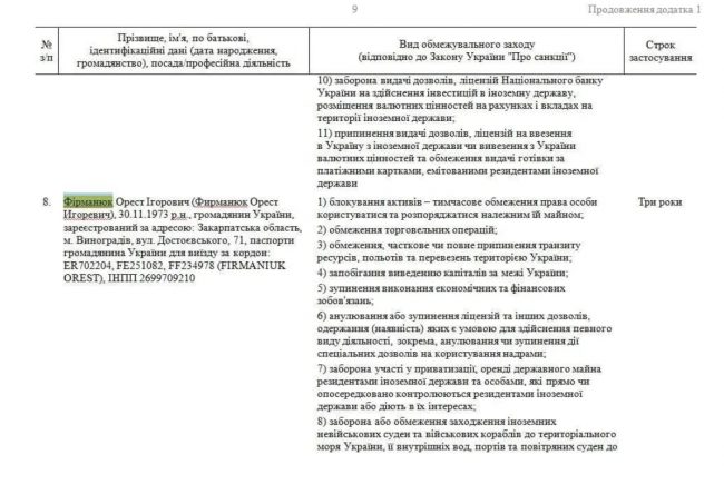 В санкционный список Фирманюк попал в апреле 2021 года. Ограничения были введены на три года. После этого, как уверяет бизнесмен, его фирмы были вынуждены прекратить работу.