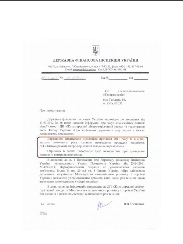 Державна фінансова інспекція відповіла на наш запит, що не проводила жодних перевірок на підприємстві протягом останніх 14 місяців і, перебуваючи з інспекцією на заводі, перевірить інформацію, викладену у запиті.