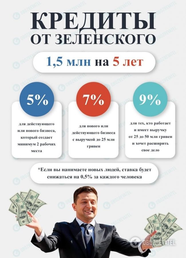 Ранее президент Владимир Зеленский заявил, что хочет выполнить инаугурационное обещание и вернуть все 65 миллионов украинцев на родные земли. В качестве мотиватора он предложил “тем, кто уехал, и тем, кто опустил руки” с 1 февраля 2020 года выдавать 1,5 млн грн кредита сроком на 5 лет на открытие либо развитие бизнеса под следующие проценты: