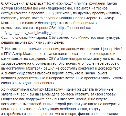 «Несмотря на тесное сотрудничество в проекте ЖК «Джек хаус», по другому проекту — жилому комплексу Taryan Towers по улице Иоанна Павла Второго 12, Артур Мхитарян выступил с беспрецедентными обвинениями в вымогательстве со стороны СБУ. Судя по словам Мхитаряна, СБУ совместно с Министерством культуры решили выбить крупную сумму денег», — отметил представитель СМИ.