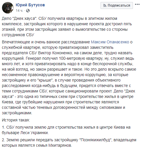 Сотрудники Службы безопасности Украины получили квартиры в элитном жилом комплексе, а застройщик, который в нарушение проекта достроил пять этажей, заявил о вымогательстве со стороны СБУ. Об этом сообщает журналист Юрий Бутусов на своей странице в Facebook. «Впечатляющее и очень важное расследование Максим Опанасенко о служебной квартире, которую приватизировал заместитель председателя СБУ Виктор Кононенко, на самом деле, трудно назвать коррупцией. Генерал получил 100-метровую квартиру, ну, служил ведь много лет, и хотя приватизировать надо в конце беспорочной службы, на мой взгляд, но закон разрешает и такое. Но это дело вскрыло самое несомненное правонарушение и вероятную коррупцию, за которые застройщику и его «крыше», в случае проведения объективного расследования когда-нибудь в будущем, придется отвечать вместе с теми сотрудниками СБУ, которые санкционировали проект. Дело «Джек хауса» — это одна из типичных схем при строительстве жилья в центре Киева, где грубейшие нарушения при строительстве являются составной частью теневых договоренностей между силовиками и застройщиками», — написал он.