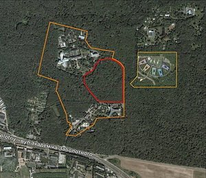На малюнку праворуч (виділене жовтим) - місце, де має розташуватись "Дитяча лікарня майбутнього". Попередній варіант її дислокації зображений червоним, оранжевим - територія "Феофанії"