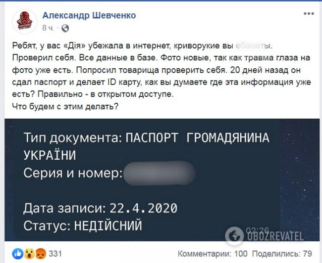 «Ребят, у вас «Дiя» убежала в интернет, криворукие вы е****ты. Проверил себя. Все данные в базе. Фото новые, так как травма глаза на фото уже есть. Попросил товарища проверить себя. 20 дней назад он сдал паспорт и делает ID карту, как вы думаете, где эта информация уже есть? Правильно – в открытом доступе», – сообщил Александр.