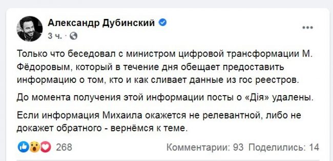 О сливе персональных данных из «Дії» сообщил и народный депутат от «Слуги народа» Александр Дубинский. Он написал в Facebook, что чат-бот предложил ему купить данные. Также нардеп обвинил Министерство цифровой трансформации, однако затем удалил свой пост.