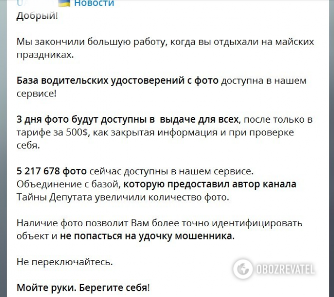 А вот 11 мая появилось сообщение о проделанной «большой работе». В незаконном сервисе появилась база водительских удостоверений с фото.