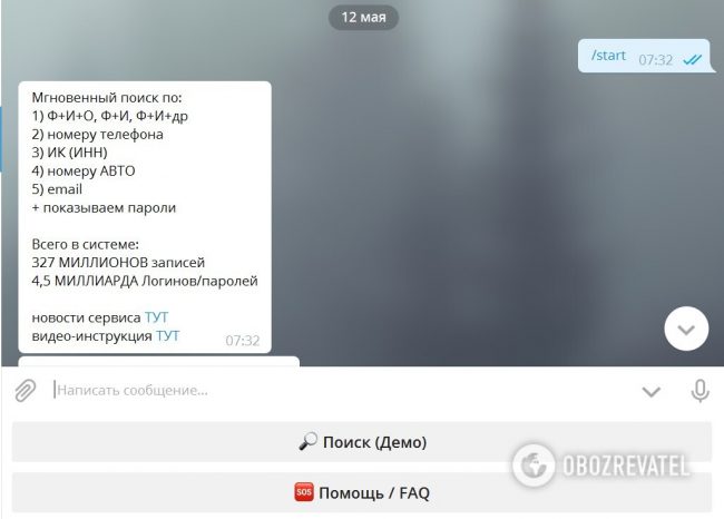 В самом же чат-боте указали, что поиск можно вести по ФИО, номеру телефона, ИНН и так далее. Бесплатно доступны только пять запросов, затем — за 500 долларов.