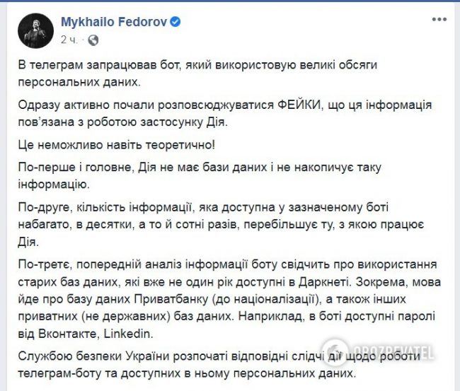 По словам Федорова, предварительный анализ информации, которую распространяет Telegram-бот, показывает, что ресурс использует старые базы данных, которые уже давно доступны в Darknet. В частности, это база данных «Приватбанка» и др.