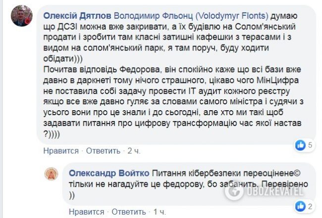 «Дія» – своего рода прослойка между пользователем и реестрами, если кто-то взломает сервер «Дії», то он получит прямой и бесконтрольный доступ к реестрам. Так что министр не прав, это вполне возможно. Они могут даже не знать об этом. Как сказал сам Федоров, «роль кибербезопасности преувеличена». Украинские ресурсы в основном защищены плохо, и никакой осмысленной политики, направленной на безопасность и защиту данных, в Украине нет», – заявил сооснователь «Украинского киберальянса».
