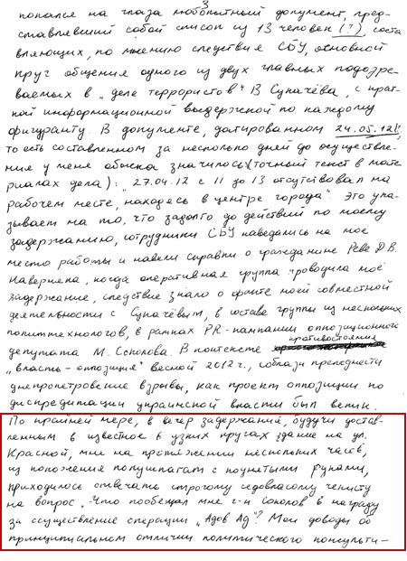 Об этом говорится в его письме, переданном в "Украинскую правду", сообщает Цензор.НЕТ. В письме излагает свои версии, почему оказался обвиняемым в деле, в том числе и политическую. По его словами, при ознакомлении с материалами дела, ему попался на глаза документ, представляющий собой список из 13 человек, составляющих, по мнению следствия СБУ, основной круг общения одного из подозреваемых Виктора Сукачева. Уже в этом документе, составленном за несколько дней до ареста Ревы, сообщалось, где он был во время терактов.