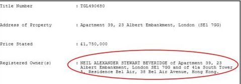 В реестре владельцев недвижимости Великобритании есть выписка в том, что владелец квартиры, которую снимает Гонтарева — господин Нил Александр Стюарт Беверидж (Neil Alexander Srewart Beweridge). Он приобрел эти апартаменты за 1 млн 750 тыс. фунтов стерлингов (62562500 гривен по курсу НБУ на 21.03.2019 года).
