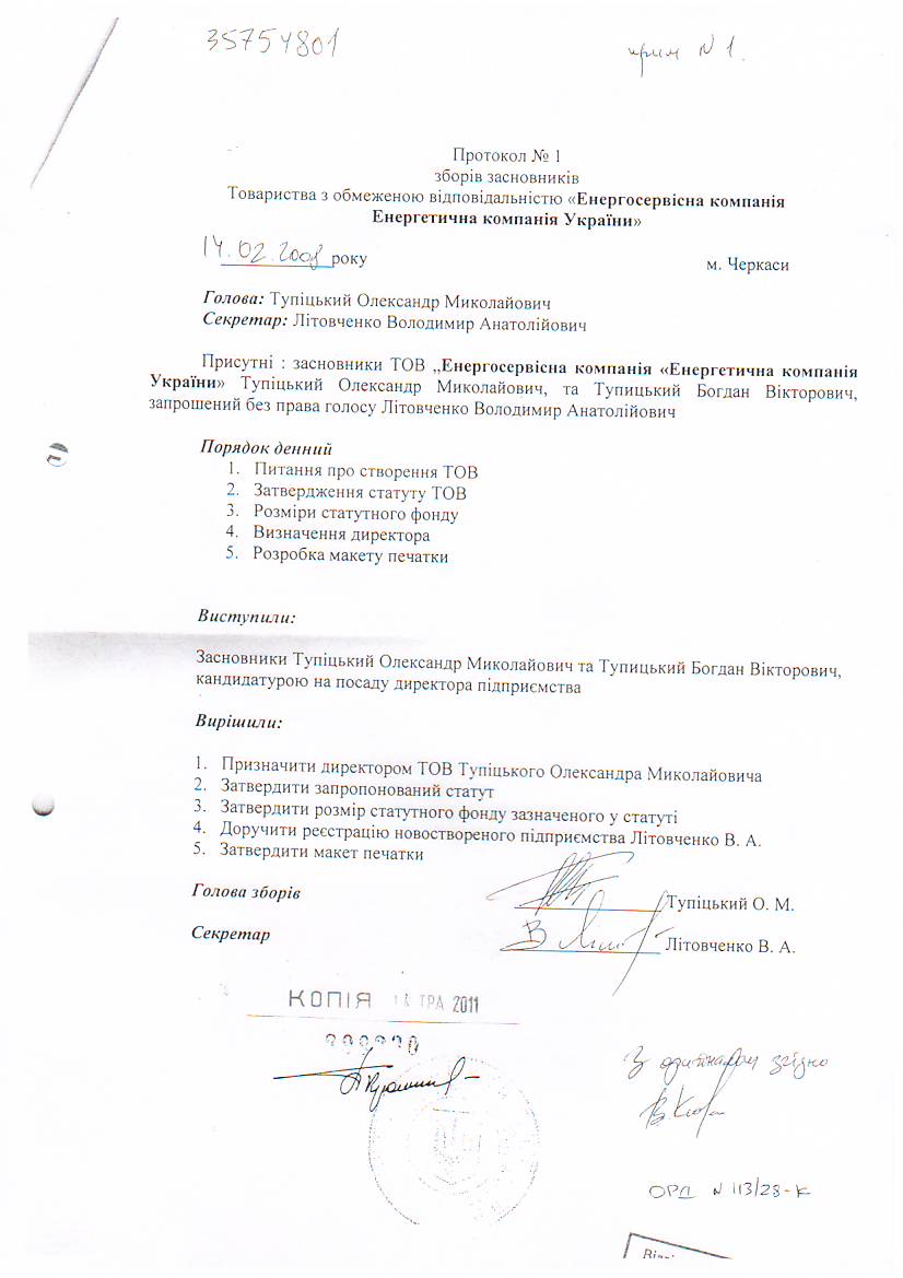 В феврале 2008 года Тупицкий Богдан Викторович совместно с Тупицким Александром Николаевичем в родных Черкассах создал и зарегистрировал некое ООО «Энергосервисная компания «Энергетическая компания Украины», код 35754801, в доказательство чего прилагаем копию протокола участников.