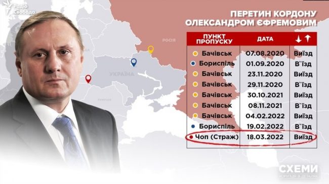 «В частности, такие выезды зафиксированы в августе и ноябре 2020 года, а также в октябре 2021-го. В последний раз Ефремов напрямую съездил в Россию прямо накануне вторжения российских войск — уехал 4 февраля 2022 года и по тому же маршруту вернулся в Украину 19 февраля. А уже 18 марта 2022 года Александр Ефремов покинул Украину железной дорогой через контрольно-пропускной пункт «Чоп (Страж)», что на границе со Словакией, и до сих пор не вернулся», — отметили авторы материала, добавив, что Ефремов находится в Москве.