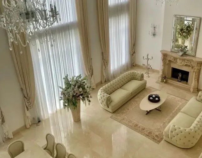 На первом этаже особняка находятся гостиная, кухня, столовая, бильярдная, кабинет, гардеробная площадью 35 квадратов, гостевой санузел, зона спа с бассейном площадью 20 квадратов, зоной отдыха, сауной. На втором этаже – четыре спальни. Есть также подвальный этаж: домашний кинотеатр, косметологический кабинет, тренажерный зал, два погреба для красного и белого вина, прачечная, шубная комната.