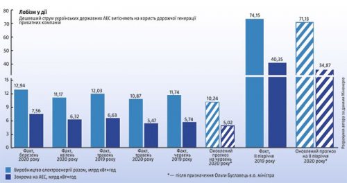 Обновленный менее чем за две недели после назначения Ольги Буславец предварительный план производства электроэнергии на 2020 год предусматривал дальнейшее резкое снижение генерации на АЭС в июне до 5,02 млрд кВт•ч (против 5,74 млрд кВт•ч в июне прошлого года) при сохранении фактически на майском уровне генерации на ТЭС и ТЭЦ (3,52 млрд кВт•ч). Еще большее снижение производства электроэнергии на государственных АЭС — на 6,5 млрд кВт•ч по сравнению с аналогичным периодом прошлого года было запланировано во втором полугодии 2020 года (см. «Лоббизм в действии»). В то же время в целом уменьшение производства электроэнергии во второй половине года ожидают только на 3 млрд кВт•ч.
