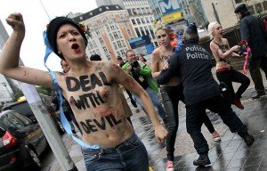 Активистки измазались красной краской и написали на груди DEAL with devil , то есть Сделка с дьяволом. Митинг прервала бельгийская полиция, она задержала FEMENисток. Позже выяснилось, что среди них была украинка Инна Шевченко.
