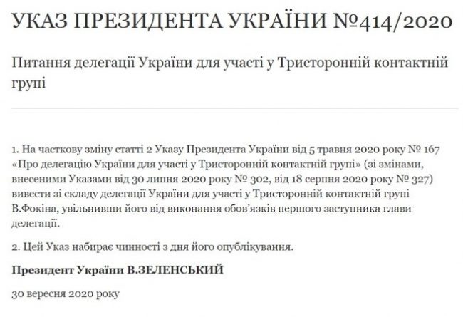 «В частичное изменение статьи 2 Указа Президента Украины от 5 мая 2020 № 167 «О делегации Украины для участия в Трехсторонней контактной группе» (с изменениями, внесенными Указами от 30 июля 2020 № 302, от 18 августа 2020 № 327) вывести из состав делегации Украины для участия в Трехсторонней контактной группе В.Фокина, освободив его от исполнения обязанностей первого заместителя главы делегации», — говорится в тексте указа.