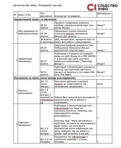 Среди запланированных действий была «превентивная коммуникация» (вероятно, речь шла о действиях по выходу расследования), включавшей две публикации в медиа.