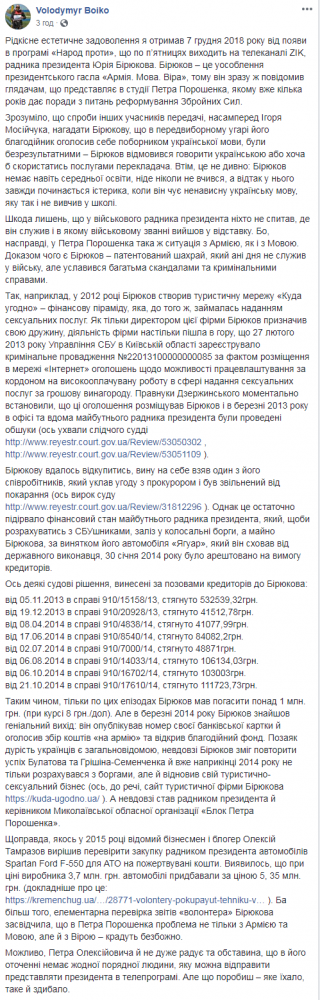 Журналист Владимир Бойко опубликовал в Facebook пост о том, что в 2012 году Бирюков создал туристическую сеть «Куда угодно», которая якобы занималась предоставлением сексуальных услуг.