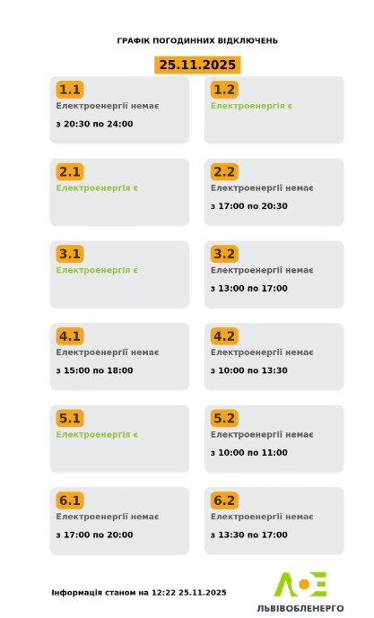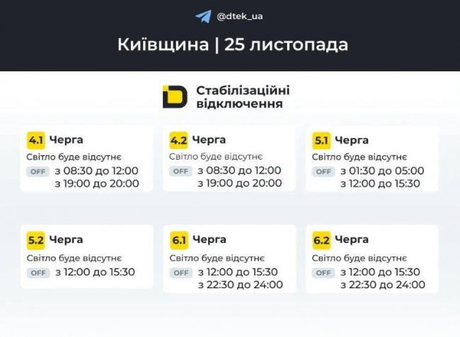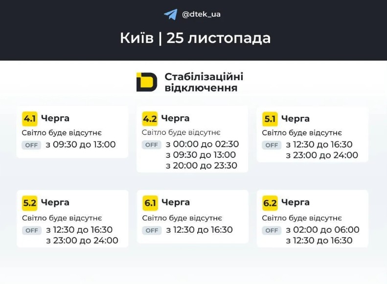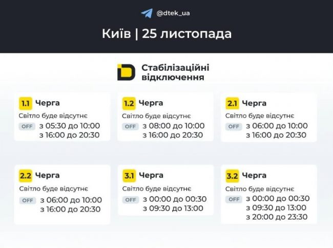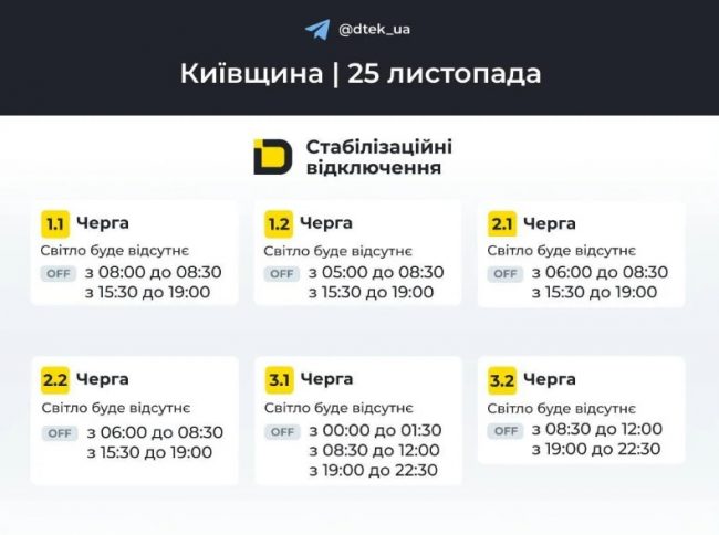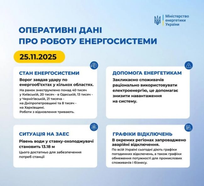 25 ноября в Киеве, а также Харьковской, Сумской и Полтавской областях ввели экстренные (аварийные) отключения электроэнергии. После 10:00 они были упразднены почти везде, кроме нескольких районов Киева и Киевщины. Кроме того, в столице во многих районах приостановлена подача тепла в дома. Почасовые отключения остаются в силе на всей территории Украины, включая те, где были аварийные отключения.