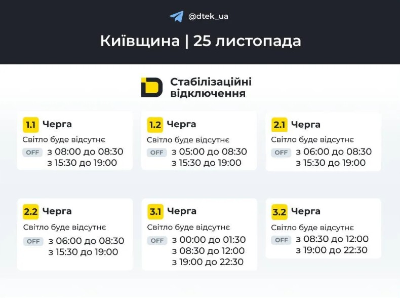 После отмены аварийных отключений по всей Украине в ДТЭК сообщили, что экстренные отключения по состоянию на 10.40 все равно действовали в Киевской области — в Броварском и Бориспольском районах . В других районах области действуют почасовые графики.