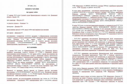 Кроме того, с августа 2018 года следственным управлением Национальной полиции в Донецкой области проводится досудебное расследование по уголовному производству №12018050000000657 по факту завладения обманным путем корпоративными правами, движимым имуществом обществ — ООО «Фортплюс» (ЕГРПОУ 40929634) и ООО «Толлинг» (ЕГРПОУ 40102199 ) и причинению их основателю — компании DILGA MANAGEMENT LIMITED (Лимасол Кипр) ущерба в крупном размере. Предварительная правовая квалификация совершенного преступления — ч. 3 ст.190 УК Украины.