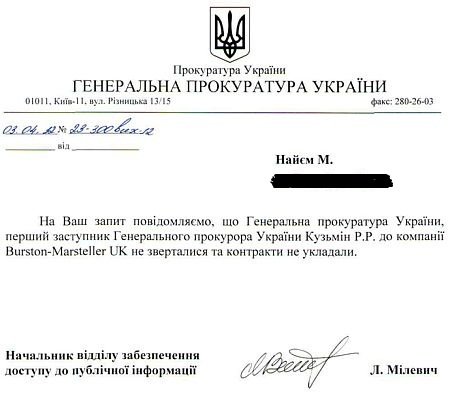 "На Ваш запрос сообщаем, что Генеральная прокуратура Украины, первый заместитель генерального прокурора Украины Кузьмин Р. Р. к компании Burston-Marsteller UK (в документе названо именно так - ред.) не обращались и контракты не заключали", - сказано в документе.