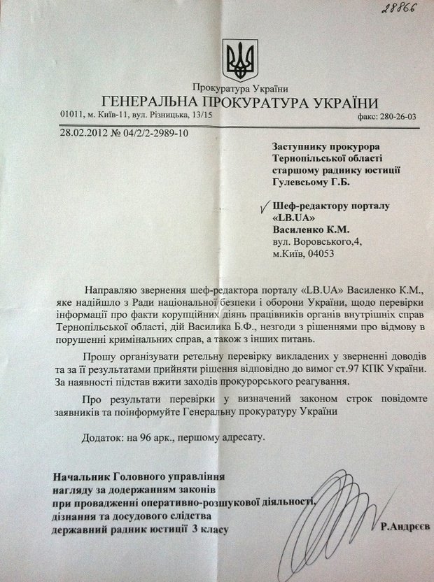 Генпрокуратура Украины направила материалы жалобы по поводу ненадлежащего криминального расследования в Козове заместителю прокурора Тернопольской области, старшему советнику юстиции Гулевскому Г.Б, с тем, чтобы организовать тщательную проверку всех изложенных доводов и по ее результатам принять решение в соответствии с требованиями ст. 97 КПК Украины.