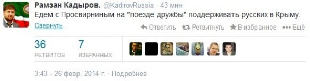 «Едем с Просвирниным на "поезде дружбы" поддерживать русских в Крыму», - написал Кадыров в своем Тwitter.