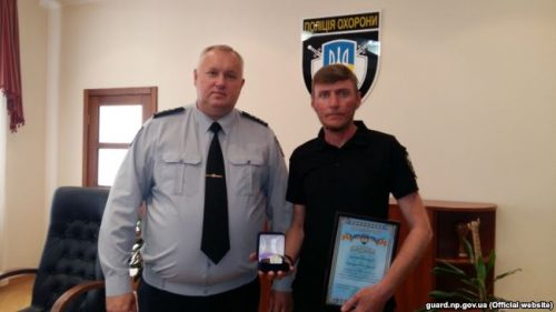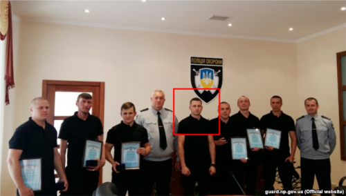 Этот мужчина, в разговоре с журналистом назвавшийся ветераном АТО, — Руслан Корнутич, — также служит в полиции охраны. Вот, например, в июне на официальном сайте департамента фотографии с ним — Руслан получает благодарность от руководства за профессиональные действия при тушении пожара.