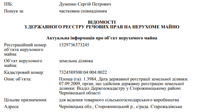 Но до сих пор Епифаний владеет несколькими земельными участками в родном селе — дом и приусадебный участок достался ему по решению суда, очевидно, в связи с получением в наследство. Кроме того, участком площадью в 1,4 гектара он обзавелся в марте этого года. Земля там имеет целевое назначение — для ведения товарного сельхозпроизводства. Сразу же после покупки Епифаний передал участок на 7 лет в аренду скандально известной «дочке» агрохолдинга «Мрия» — ООО «Мрия Фарминг Буковина», которую нардеп Максим Бурбак весной этого года обвинял в земельном рейдерстве.