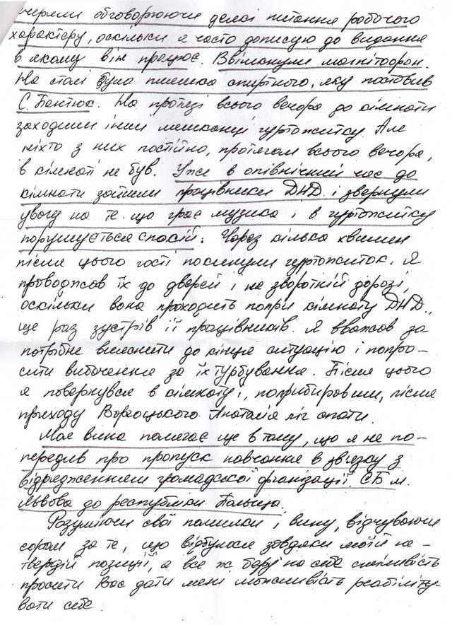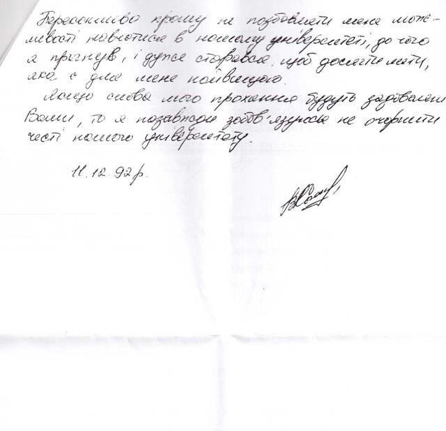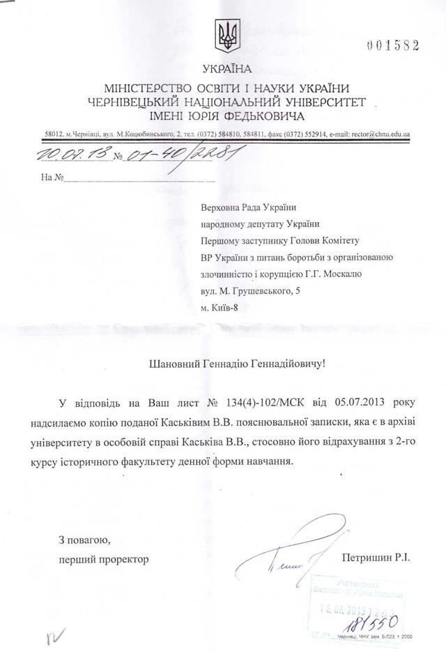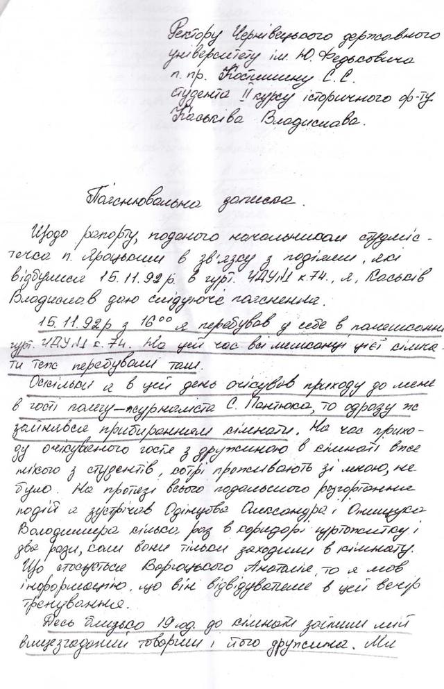 “Руководство Черновицкого национального университета им.Ю.Федьковича в ответ на мое обращение направило копию пояснительной записки студента 2-го курса исторического факультета Владислава Каськива, написанную им в декабре 1992 года. В которой нынешний руководитель Госагентства просит прощения за организованную в общежитии пьянку, берет на себя смелость просить возможность реабилитировать себя и навсегда обязуется не чернить честь университета“, — сообщает пресс-служба депутата.