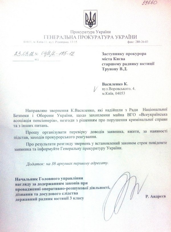 ГПУ поручила зампрокурору города Киева организовать проверку доводов заявителя о рейдерской атаке на здание Всеукраинской Ассоциации пенсионеров.