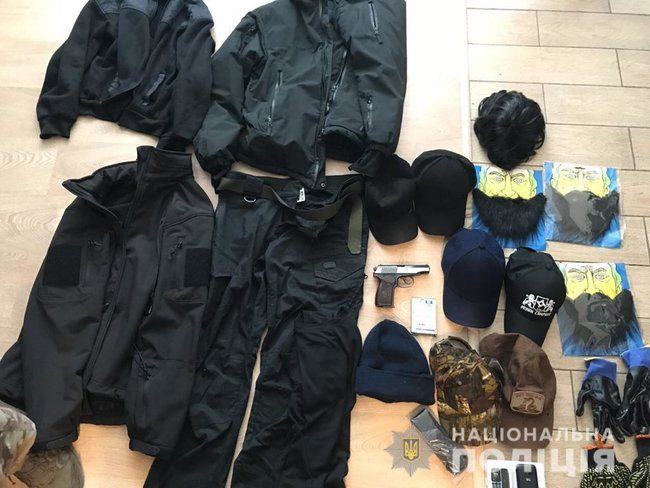 В ходе проведенных 18 неотложных обысков по месту жительства фигурантов, работники полиции обнаружили и изъяли большое количество разнообразного оружия, гранаты, глушитель, рации, пластид, дымовые шашки, чтобы прикрывать пути отхода, а также парики, пластиковые стяжки, кастеты, ломы, мобильные телефоны, банковские карточки, резиновые перчатки, дорогостоящие инструменты, приспособления и оборудование, такое как телескопические лестницы и палки, наркотические вещества, деньги.