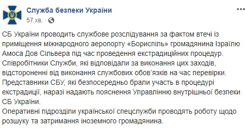 Прокуратура начала расследовать побег из-под конвоя Службы безопасности Украины при экстрадиции в Израиль гражданина США и Израиля Амос Дов Сильвера, подозреваемого в создании международного В сообщении пресс-службы прокуратуры Киева сказано: «Прокуратурой города Киева начато уголовное производство по факту побега на территории международного аэропорта «Борисполь» иностранного гражданина при осуществлении его экстрадиции в Государство Израиль».