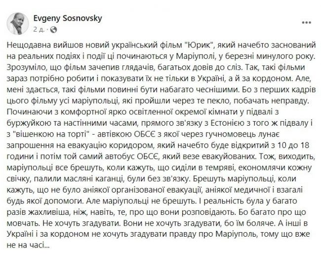 «Из первых кадров этого фильма все прошедшие через этот ад мариупольцы увидят неправду. Начиная с комфортной ярко освещенной отдельной комнаты в подвале с буржуйкой и настенными часами, прямой связи с Эстонией с того же подвала и с «вишенкой на торте» – автомобилем ОБСЕ, из которого из-за громкоговорителя звучит приглашение на эвакуацию коридором, который вроде бы будет открыт с 10 до 18 часов и затем тот самый автобус ОБСЕ, который везет эвакуированных. Выходит, мариупольцы все врут, когда говорят, что сидели в темноте, экономя каждую свечу, жгли масляные светильники, были без связи. Врут мариупольцы, когда говорят, что не было никакой организованной эвакуации, никакой медицинской и вообще какой-либо помощи», – поделился известный фотограф и актер Евгений Сосновский, который больше двух месяцев прожил в блокадном городе.