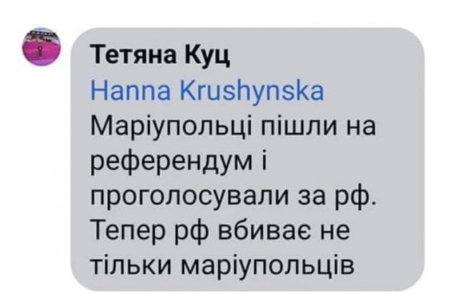 «Мариупольцы пошли на референдум и голосовали за РФ. Теперь РФ убивает не только мариупольцев, но мы за вас боремся тоже», – выдала кинематографистка.