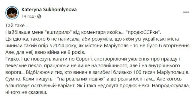 «Больше всего меня «вштирило» от комментария какой-то… «продюсерки». Эта идиотка такого бы не написала, если бы понимала, что если бы все украинские города оказывали такое сопротивление с 2014 года, как горожане Мариуполя – то не было бы вторжения. Но для нее, очевидно, война длится не 9 лет, противно, и это повезут катать по Европе, искажая представление о правде и адском аду, работая не только на внешнего, но и на внутреннего врага, отбеливая тех, кто виноват в гибели около 100 тыс. мариупольцев. Грустно. Когда пишут – «на реальных событиях», а до реальности там… Но кого-то устраивает «облегчённый» вариант», – оставила комментарий марупольчанка.