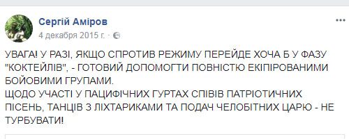 Некоторые его посты в ФБ можно расценить как призывы к госперевороту – например, предложение «помочь полностью экипированными боевыми группами» желающим начать восстание против «режима внутренней оккупации». Такое сообщение «Сергей Амиров» опубликовал за 5 дней до своей смерти.
