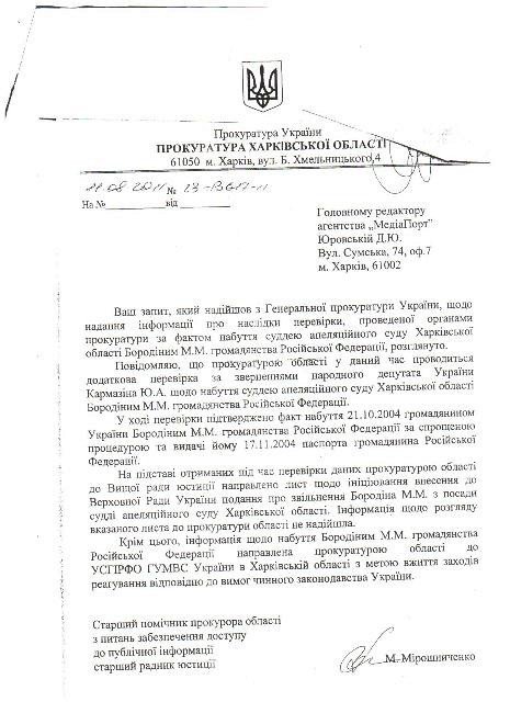 По информации Генеральной прокуратуры Украины, проверку информации о «двойном» гражданстве М.Бородина проводит прокуратура Харьковской области, поэтому информационный запрос относительно результатов проверки был переадресован туда.