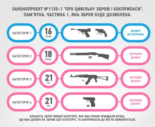 Согласно ст. 4 проекта закона, выделены 4 вида гражданского оружия и боеприпасов: