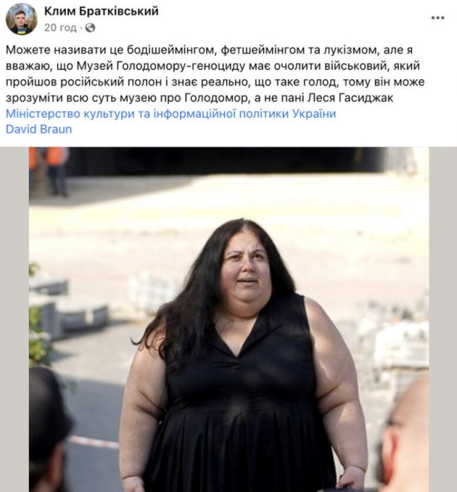 В комментариях его попросили остановиться и прекратить оскорблять женщину из-за ее внешнего вида. Знакомые с Лесей Гасиджак отметили, что она превосходный специалист своего дела и фигура никак не влияет на знания истории или профессионализм. Клима Братковского обвинили в бодишейминге, фетшейминге и лукизме, а также отметили, что он не знает ничего о состоянии здоровья Гасиджак и поэтому не может отзываться о ней в таком тоне.
