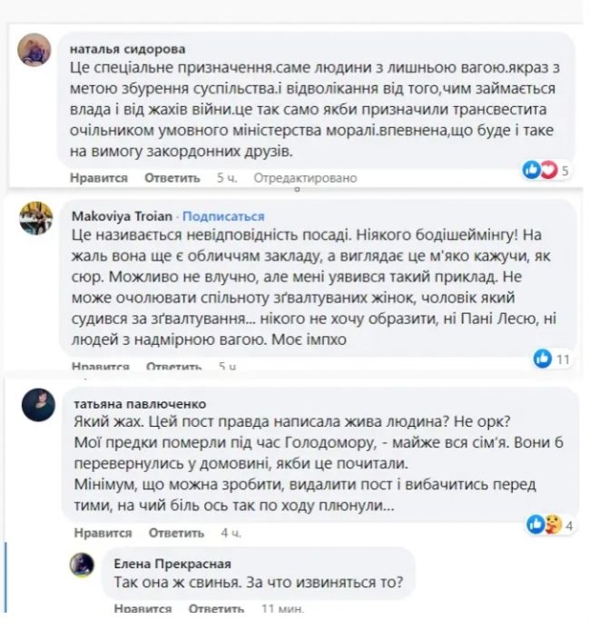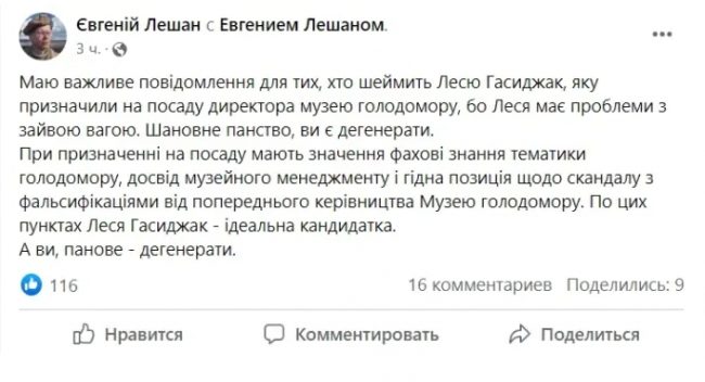 «При назначении на должность имеют значение профессиональные знания тематики голодомора, опыт музейного менеджмента и достойная позиция по скандалу с фальсификациями от предыдущего руководства Музея голодомора. По этим пунктам Леся Гасиджак – идеальная кандидатка. А вы, господа – деге****ты», — написал он.