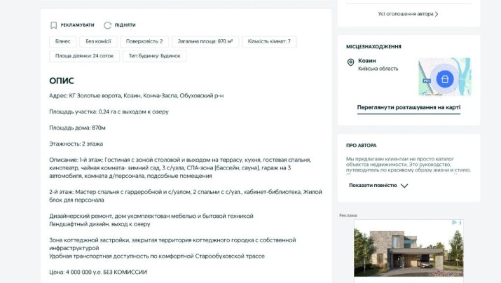 Об этом сообщил журналист-расследователь Михаил Ткач. Издание «Украинская правда» опубликовало ссылку на объявление о продаже дома.