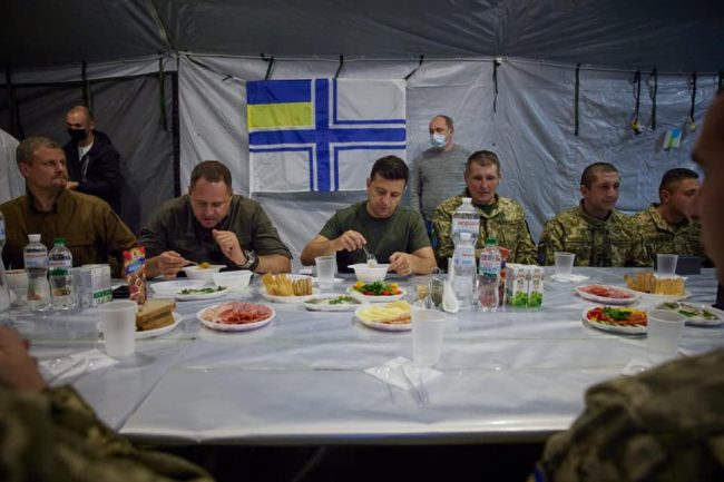 В среду, 14 октября, президент Владимир Зеленский вместе с главой своего офиса Андреем Ермаком съездил в зону проведения операции Объединенных сил, чтобы вручить военным награды по случаю Дня защитника Украины. Там для Зеленского и Ермака организовали обед вместе с военными. В принципе, в этом нет ничего странного, обедал с военными и бывший президент Петр Порошенко. Но, первым снимком с мероприятия на сайте Офиса президента оказалось фото, где Зеленский и Ермак едят рядом с военными, возле которых нет ни еды, ни приборов. Именно этот снимок вызвал волну критики и негодования.