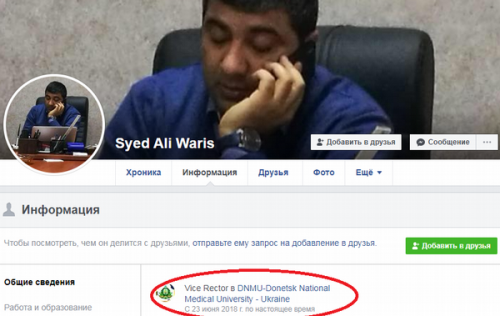 Хозяин фирмы-рекрутера выдает себя за «вице-ректора». Аккаунт фальшивого проректора Донецкого медуниверситета, на странице которого опубликован адрес фальшивого сайта и фальшивой страницы Вуза в ФБ