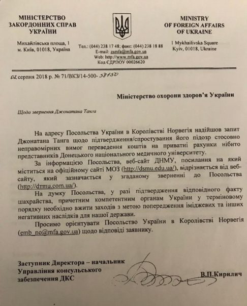 К осени 2018 из Министерства иностранных дел уже пришло письмо о том, что есть поддельный сайт Вуза, с которого кто-то требует оплату на частный счет и все это наносит ущерб Украине. Эту инфу администрация Вуза отправила в СБУ Донецой области (аминистрация Вуза находится в Краматорске) еще 17 сентября 2018 г.