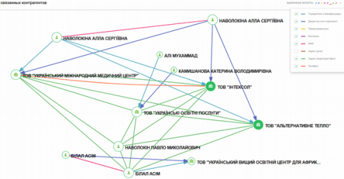 Эта схема связей «Украинских образовательных услуг» показывает, что по одному адресу с фирмой Али зарегистрированы еще три фирмы, имеющие, как и первая, признаки фиктивности. Их учредила та же гражданка Наволокина.
